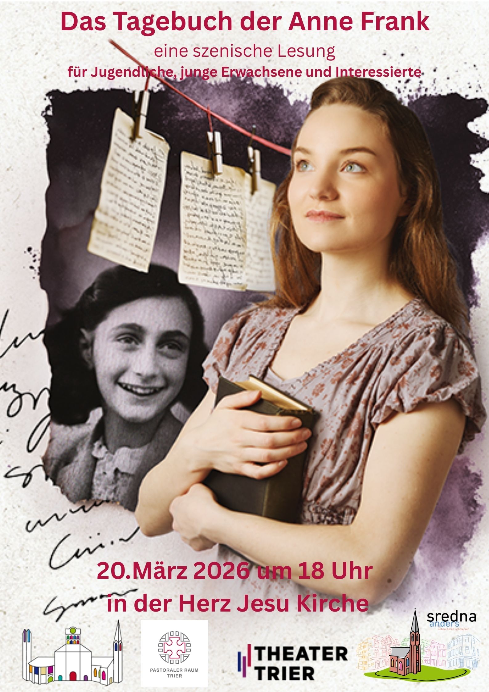 Der Eintritt ist frei, um eine Spende wird gebeten.Eine der berührendsten und meisterzählten Geschichten über den Holocaust und gegen das Vergessen. Anne Franks Tagebuch gehört zu den wichtigsten Originildokumenten der NS-Judenverfolgung und gibt Einblick in eine schwarze Epoche unserer Vergangenheit. Aber auch in die hoffnungsvolle Welt eines jungen Mädchen, das aufgrund seiner Geschichte und seiner unerschütterlichen Hoffnung niemals vergessen wird.